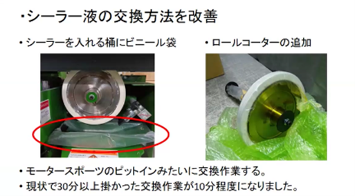 - この時間ロスを削減するため、モータースポーツの迅速な作業交換に着想を得た「ピットイン方式」を導入。具体的には、シーラー液を入れる桶にビニールを巻いて使い捨てにし、硬化したロールコーターは予備機と即座に交換する手順を確立し、交換・清掃にかかる時間を10分程度にまで短縮することに成功した。