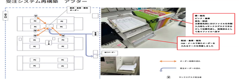 - 受注システムの再構築(サンクスデスク) 従来はその人しかわからない属人化された体制であり、非効率な上に担当者の不在時に業務が滞るリスクを抱えていた。この問題を解決するため、4名のスタッフが受注から伝票発行までを一元的に処理する「サンクスデスク」構想を導入した。これにより、業務フローは受注 → 一時保管 → 下処理 → 入力待ち → 入力処理 → 処理済みという標準化されたプロセスに再構築された。